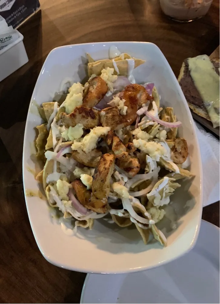 Corn tortillas cut in quarters and lightly fried are the basis of the dish. Green salsa cheese and chicken.