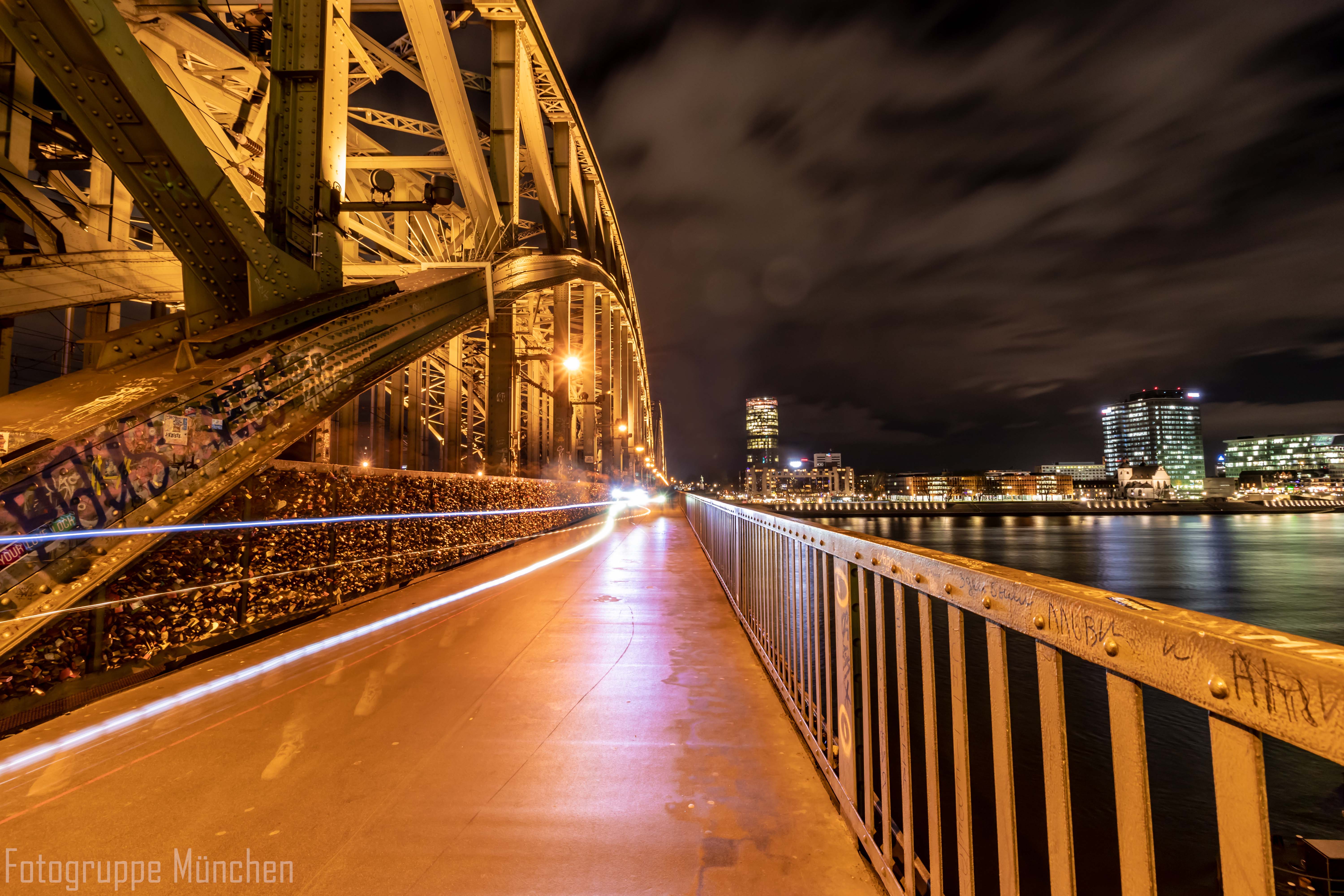 Hallo zusammen. Mein heutiges Bild ist noch aus Köln und zeigt die Hohenzollernbrücke der Dom war genau im Rücken von mir. Gar nicht so leicht bei Wind, Fußgänger und Zugverkehr auf einer Brücke zu fotografieren. Hatte auch nur mein kleines Reisestativ dabei was ich dann mit mein Händen nach unten gedrückt hatte um es etwas zu stabilisieren. Radfahrer sei dank ist auch noch ein schöner Lichtstreifen mit im Bild ;) Wünsche euch allen noch ein schönen Abend!