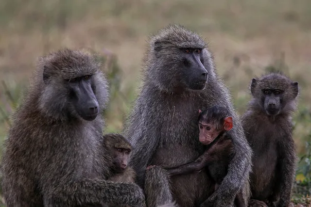 1: Two mother olive baboons embrace their adorable babies. A troop of baboons can get quite large, with up to 150 or more members. To the local human population, they are often considered pests.