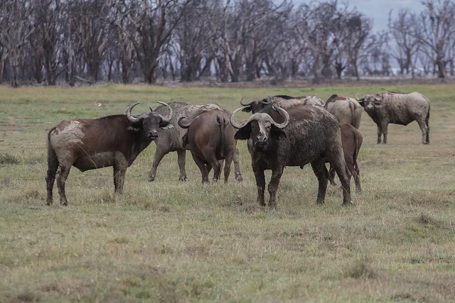 3: These African or Cape buffalo are coated in mud from a nearby watering hole. The mud helps remove parasites when it dries and falls off.