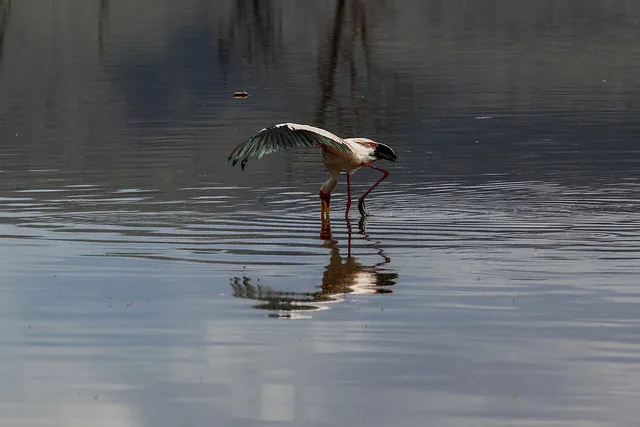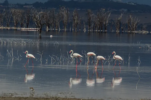 6: Lesser flamingos are numerous around the lake, with their characteristic pink features. They are one of six species of flamingo that exist.