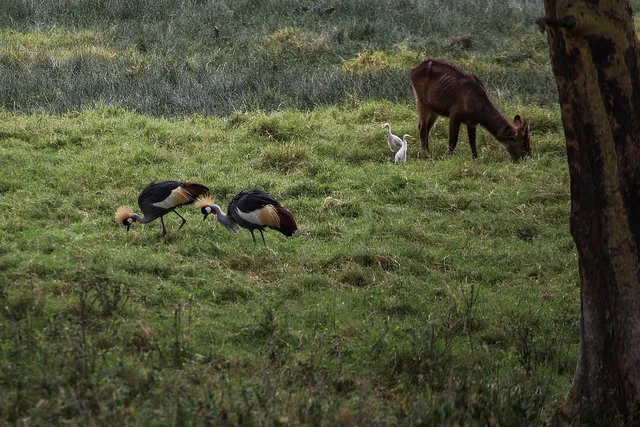 9: A pair of one of my favorite African birds, the crowned crane are in the foreground. A female waterbuck and a pair of cattle egret are in the background. It is normal to see these egret in close proximity to large mammals, waiting to feed on insects disturbed by the mammals.