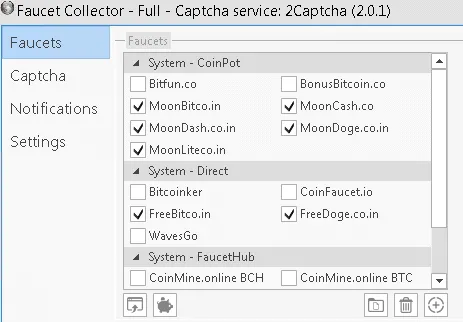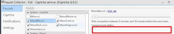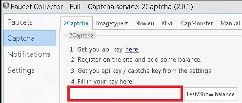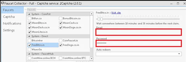 Bedava Coin kazanılan sitelerde manuel işlem yaparak coin kazanabilirsiniz. Ancak buna hiç gerek yok. Captcha'ları da faucetcollector programı otomatik olarak çözebiliyor. Bu işemi yapabilmeniz için, kendinize captcha kredisi yükleyebilirsiniz.10 Usd'lik bir kredi uzun bir süre gidecektir. Tavsiye ediyorum. Captcha'ları elle girmek uğraş vericidir. Ben 2captcha https://goo.gl/772BYt servisini kulanıyorum. Oldukça hızlı ve ucuz.