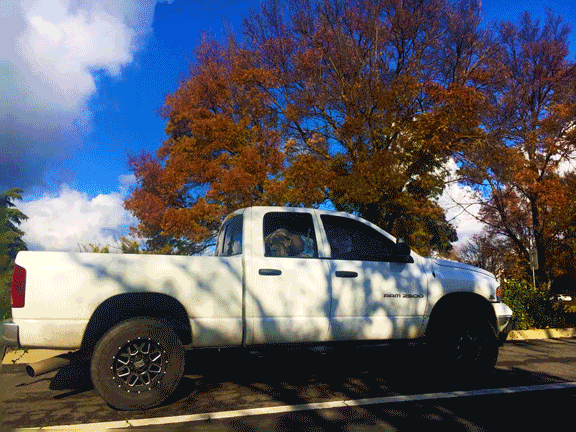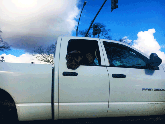 Luckily, we came upon a railroad track crossing and had to slow down. I got a closer look when the truck and my car were side by side. I found out that it was a black dog!