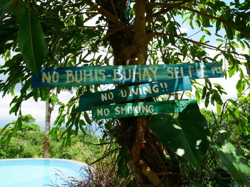 The lower pool has a clear sign "No Buhis-Buahy Selfie pls". This means "No life-endangering selfies pls", probably that has been instances in the past where visitors took selfies on the edge of the pool. From the pool is quite a long slide down the mountain but some people do a lot of stupid things for a selfie. Along with the rules are no diving and smoking in the pool.