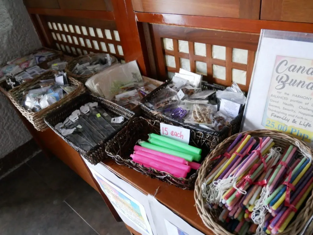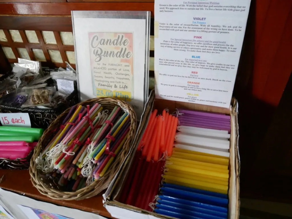 Near the exit of the long hallway where the statues are displayed, candles and souvenirs are sold. The candles are color-coded depending upon your need.