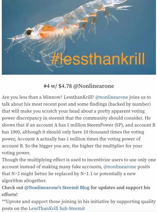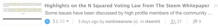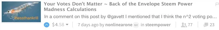 p.p.s On the issue of incetivzing people to buy Steem Power - I didn't bring this up in the discussion, but I wanted to mention that I had put in something like $150 USD into steem power before earning any significant money on steemit. I had noticed it made pretty much no difference compared to having only a few SP, so there seemed to be no incentive. With a different vote weighting function, this could change and people would have more incentive to purchase 100 to 1,000+ SP.