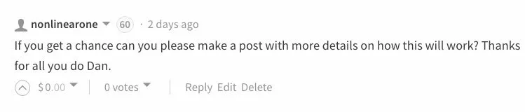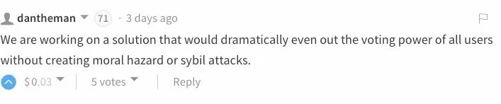 The man himself, @dantheman, made a quick comment on my recent n^2 voting power law post. Here it is: