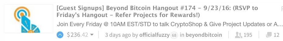 So what happened was @brindleswan got in touch with me and asked me to go on to @officialfuzzy's awesome Beyond Bitcoin audio hangout. I didn't know anything about this event. It turned out to be great. I recommend it very highly. Here's a link to the audio. The part where we talk about this post starts at 1:09 and ends at 1:39.