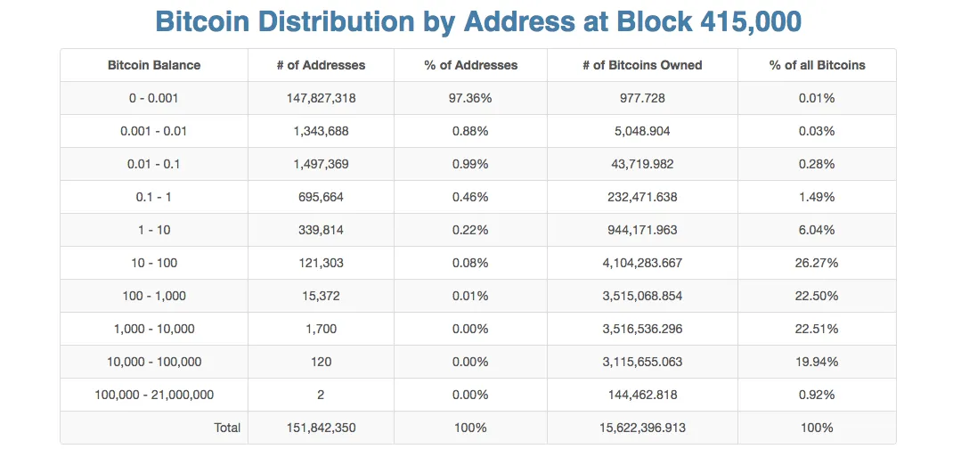 - Almost 148m addresses with less than 0.001 BTC held: These accounts hold less than $0.65 per address. Unless there is a program that can spread BTC very thin across many account, these accounts can be completely disregarded. Less than 1000btc are held across these addresses which amounts to <0.01% of BTC in circulation. Thus, I will view these as dud accounts.