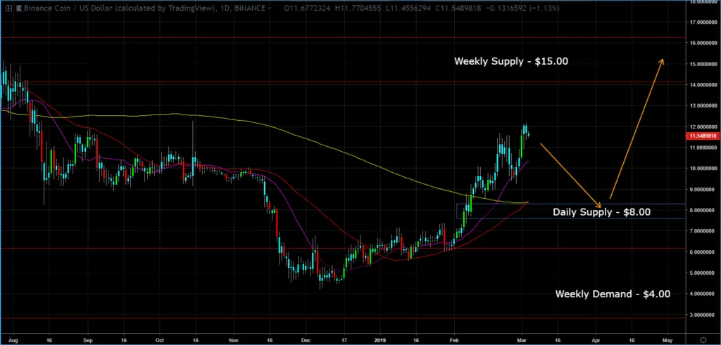 The chart suggests to go long if price pulls back to the daily supply at $8.00, with a short term target at $15.00.