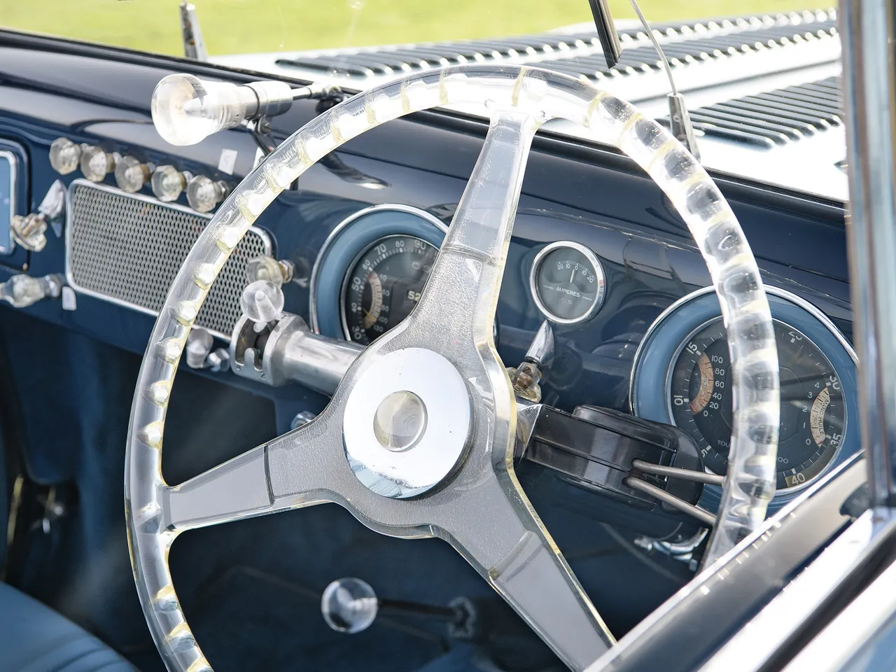 This model was restored by Carrosserie Lecoq, French restorer and finished in chrome & black over a light blue interior with a steering wheel in clear plexiglass. So luxurious...