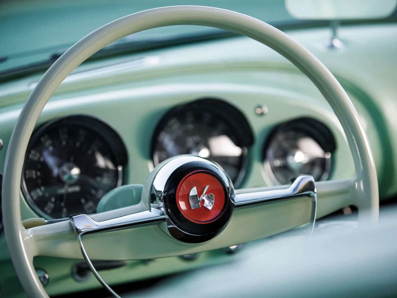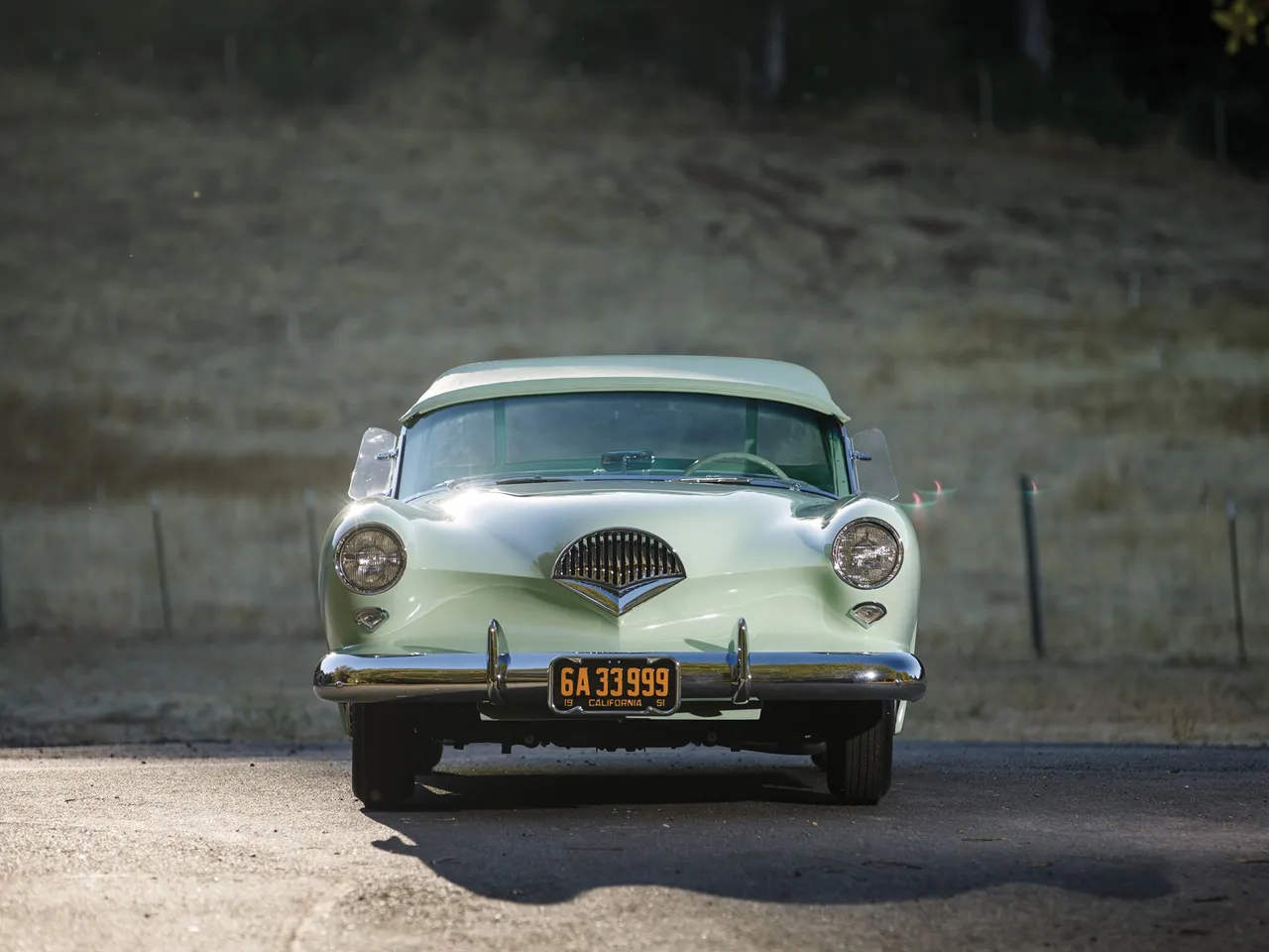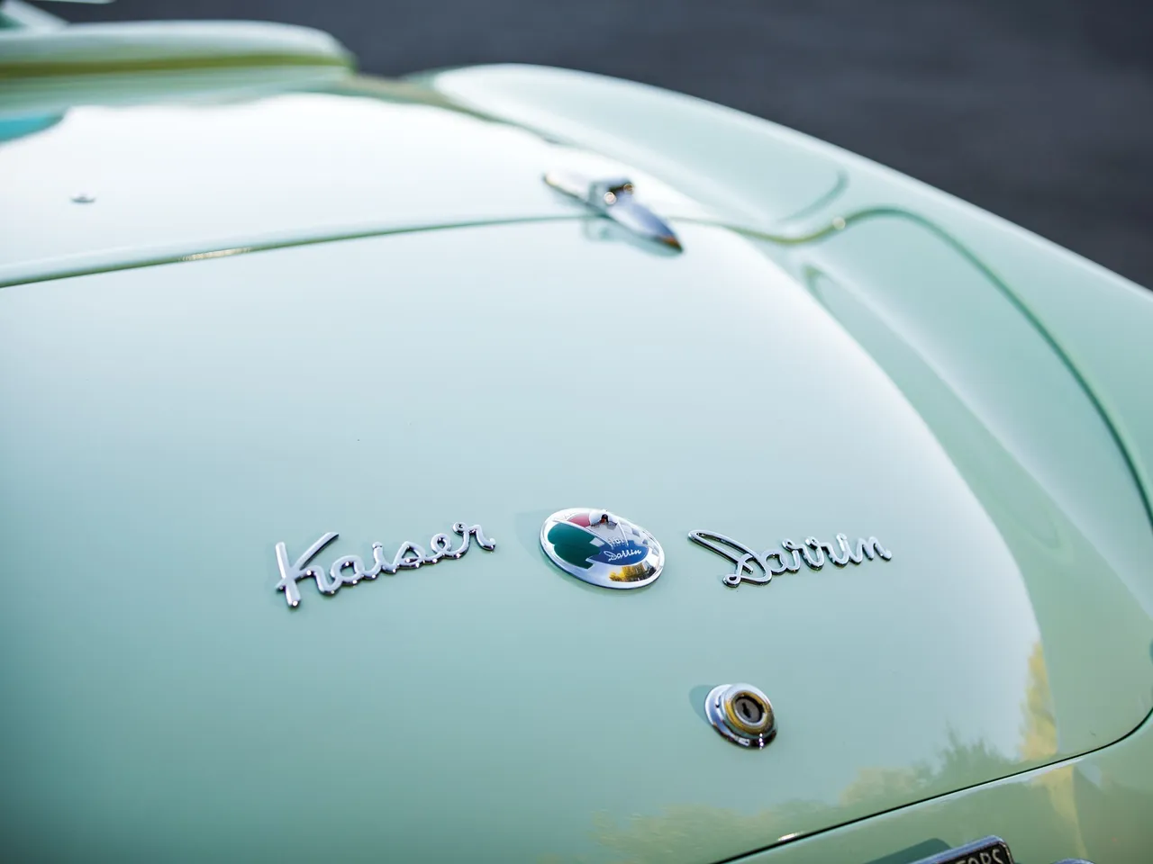 With its fiberglass coachwork, the Kaiser Darrin has an engine 2.6 Liter F-head six cylinder producing 90 hp. This model was completely restored in 1999 with this Pine Tint green.