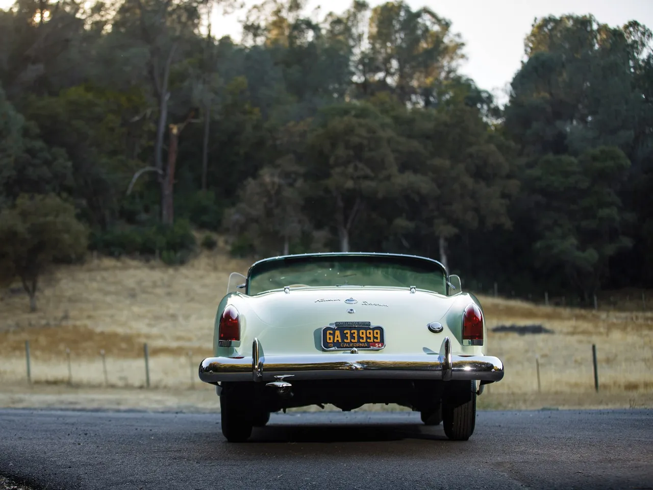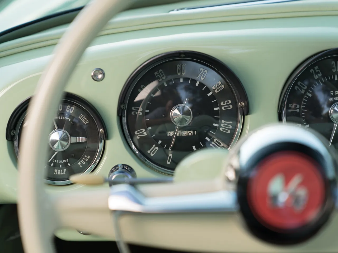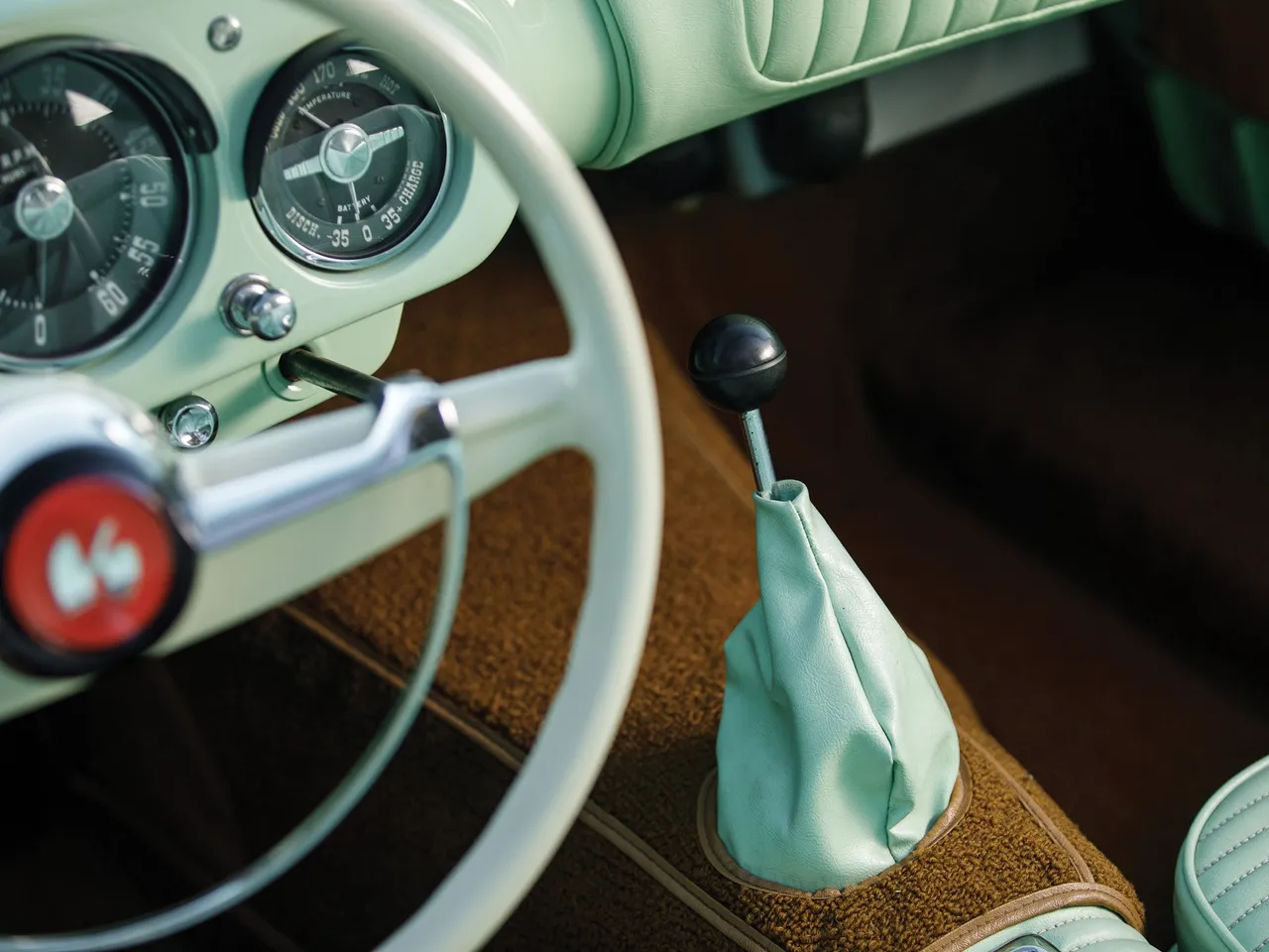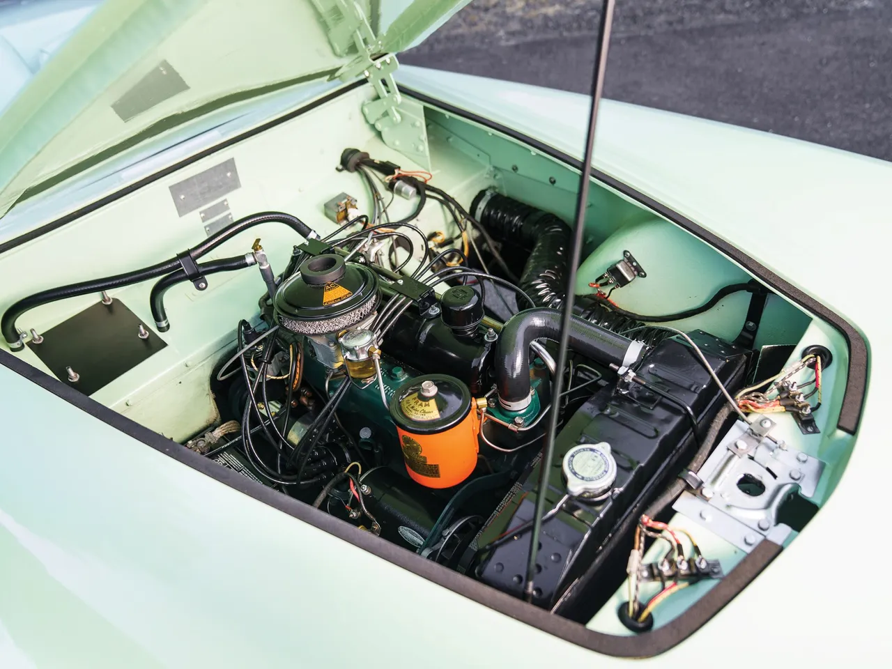 With its fiberglass coachwork, the Kaiser Darrin has an engine 2.6 Liter F-head six cylinder producing 90 hp. This model was completely restored in 1999 with this Pine Tint green.