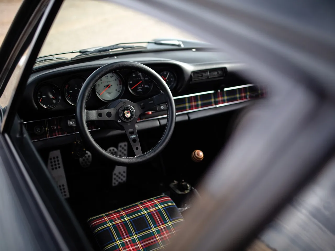 Finished in Slate Grey with the fuel filler in middle of the hood (like the old Porsche R/RSR), the interior has leather racing seats with Tartan inserts. I like it.