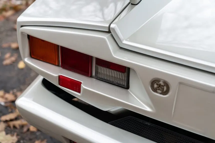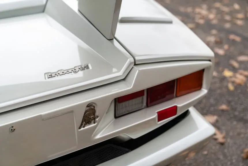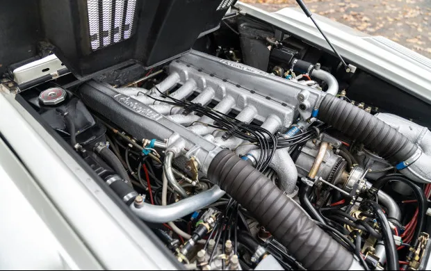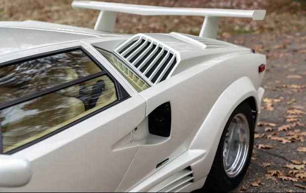 This 25th Anniversaryis based on the Countach LP5000 Quattrovalvole (5000 QV), the 5.2 L engine has 4 valves per cylinder (quattravalvole) with the carburetors on the top to improve the cooling (but decrease the rear view, almost zero).