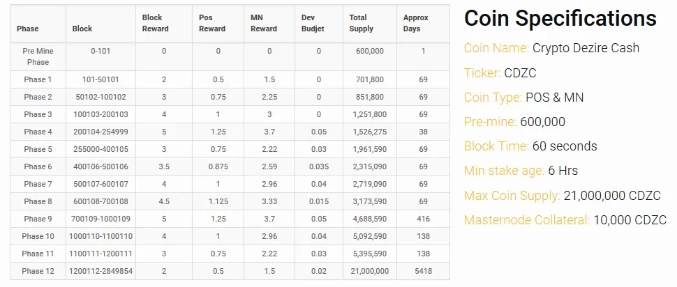 Other important feature that got an update was the reward chart, this chart contains the specific information about CDZC present a future rewards. You can visit CDZC website to get more information about CDZC masternode and staking rewards. Also, you can visit CDZC blockexplorer to get detailed information about current performance of CDZC Blockchain. We currently are in the Phase 4 of the reward chart.