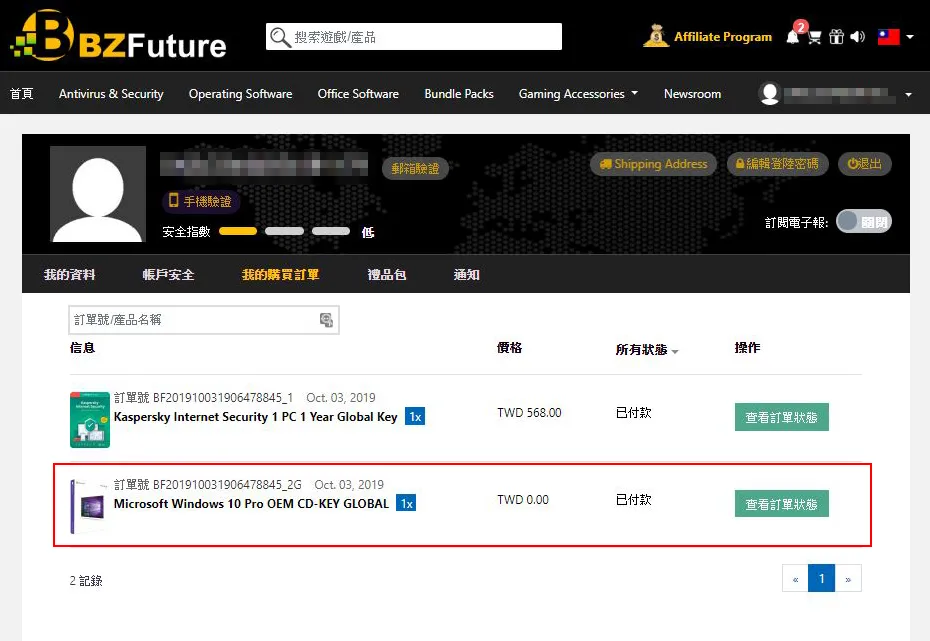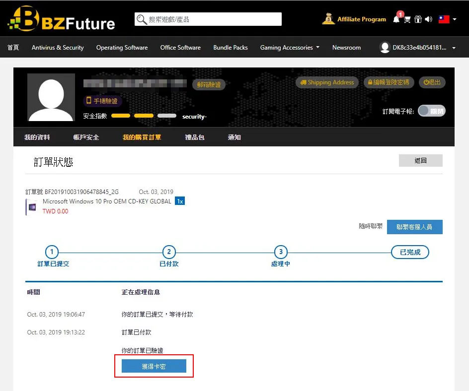 付款之後,立刻就可以在我的購買訂單中看到你購買的掃毒軟體以及Windows 10。如果你沒有看到贈送的Window10,表示購買過程有操作錯誤。此時請勿驚慌,在序號沒有讀取之前,15天內都可以退貨,所以尚未確定之前,千萬不要領取金鑰。
