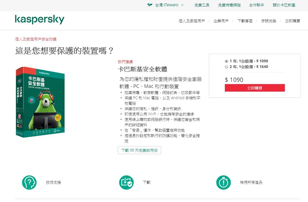 - 想要比較完整的防護可以選擇 Kaspersky Internet Security 1 PC 1 YEAR Global 單機一年授權TWD$568 或 Bitdefender Internet Security 1 PC 1 YEAR key Global TWD$688