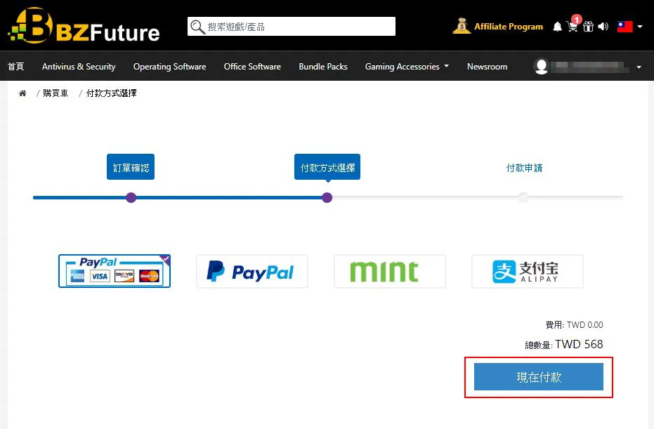 選好要買的防毒軟體之後,按下現在購買,就會直接跳到付款頁面。