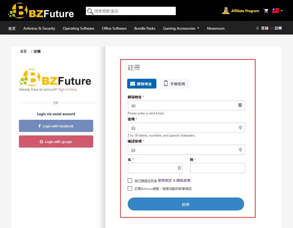 你也可以使用facebook或google帳號快速登錄,但是註冊一個新帳號會收到email提供一個折扣碼,全站的產品都可以使用(這次的防毒軟體特惠例外),大家可以自行決定。