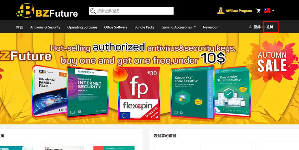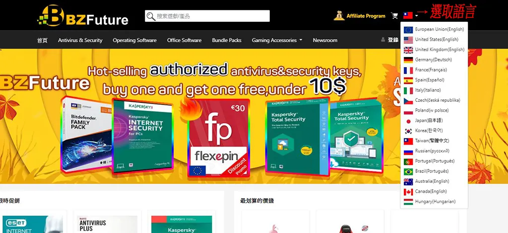 首先來到BZFuture首頁,先申請帳號才能購買。進到首頁可以先在右上角找到國旗的小圖示,下拉選擇你習慣使用的語言。