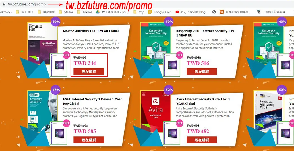不要以為是廠商的活動是為了促銷不熱賣的防毒軟體喔!這次促銷的防毒軟體很多都是評比排名前幾名的Anti-Virus防毒軟體,包括McAfee、卡巴斯基、ESET、小紅傘等受歡迎的防毒軟體,而且折扣高達20~60%,比在官網上購買便宜許多,不趁著這個機會下手真的太對不起荷包了!有需求的朋友們一起來剁手吧!