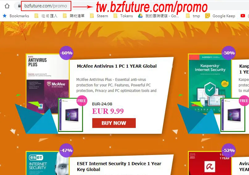 剛好運氣超好發現了這個超級好康,趕緊來跟大家分享。現在只要購買BZFuture Autumn Sale 促銷網頁上的防毒軟體,就免費贈送Windows 10 Pro 專業隨機版序號!