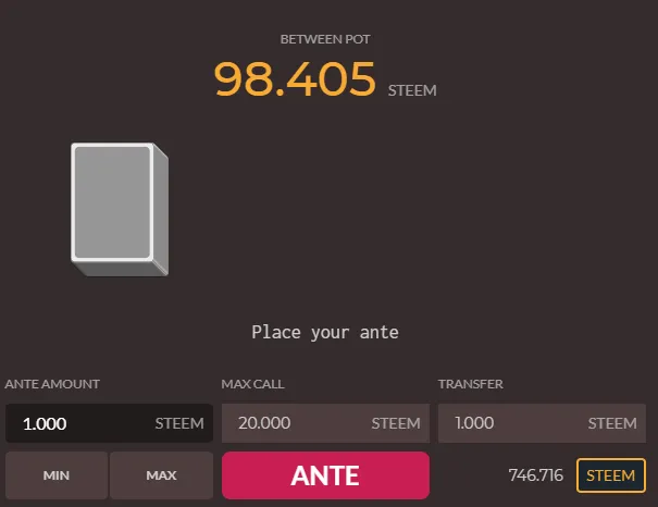 - 簡單流程:每次遊戲都得先下「底注」(ANTE),這個錢是不退還的,目前是設定最低1 STEEM。下完才能抽兩張牌;看兩張牌後,你可以決定要不要繼續,要繼續就是下CALL,額度在1-10倍的底注之間。例如,你底注是2 STEEM,你CALL可以是2-20 STEEM。或是蓋牌,放棄這一輪,看下一副運氣是不是好點... 如果繼續,就是抽第三張牌,命運降臨!