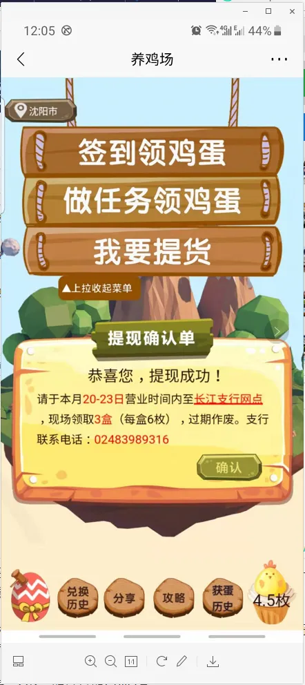 当鸡蛋攒够六枚且就可以在每月的15日申请兑换,因为我错过了好几个15日,最终攒了20多枚鸡蛋,终于在12月15日的时候想起来了。