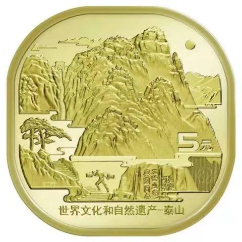 泰山纪念币全称是世界文化和自然遗产--泰山普通纪念币,面值五元,发行数量为1.2亿枚,圆角正方形的外观,据说是央行发行的首枚流通异形纪念币。