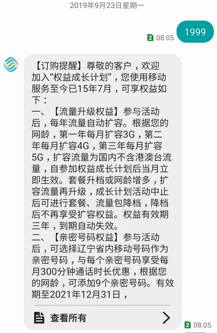 擦,我的信息咋还不符了呢?还有网龄回馈流量扩容又是什么鬼?往前翻记录,大概想起来是怎么回事了, 大概8、9月份大家都在传发送1999