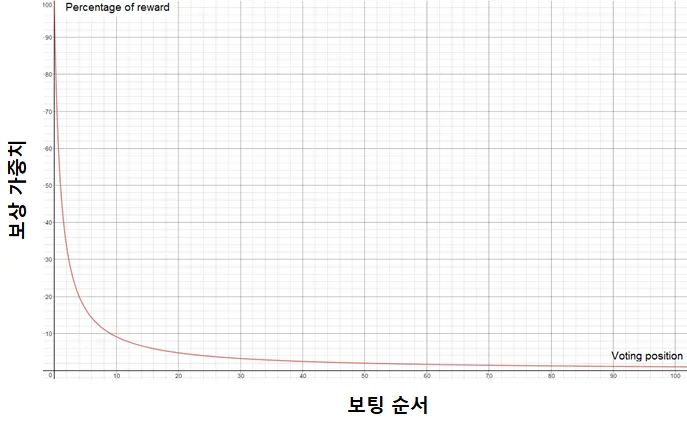 구현하는 것은 그렇게 어렵지 않겠습니다. 보팅 순번이 빠를 수록 전체 큐레이션 보상의 더 큰 지분을 가지게하면 됩니다. 마침 앞서 분석해주신 분(@calamus056)이 계시네요. 그 분이 모델링하셔서 만드신 그림을 잠시 빌려와 봅니다. 정확한 모델링 수식은 못찾으셨고, 거의 비슷한 그림을 그리는 식을 사용하셨다네요.
