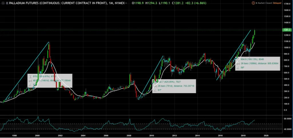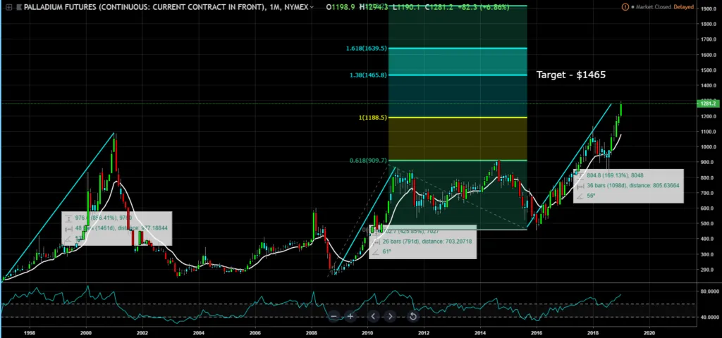 Palladium sister metal, platinum is now trading near a 10-year low, at about $820 an ounce, while palladium is near $1,325 an ounce. Palladium has some features that make it more suitable for gasoline or hybrid cars, like better resistance to higher temperatures. However, switching to platinum would take years. Palladium prices are evening trading higher than gold at this point, so how much higher can palladium go, lets go to the charts to find out?