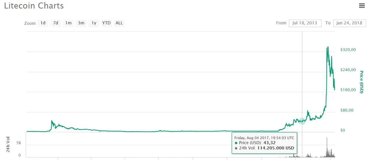 Seppur esista chi riesca a guadagnare compiendo piccole operazioni nell'arco di un giorno (day trading), nel mondo delle criptovalute il grosso dei guadagni si fa con investimenti a lungo termine, dai 2 ai 5 anni ed oltre. La domanda che si fa più spesso quando si parla di criptocoin è "ma è un buon momento per investire? magari aspetto che scende un altro po'". La verità è che quando un progetto dietro un coin è valido, potete essere sicuri che da quando lo acquistate a cinque anni, il suo valore sarà aumentato di 10, 100, se non 1000 volte. Guardate ad esempio il grafico sottostante che mostra l'andamento dei Litecoin/LTC dal 2014 ad oggi.