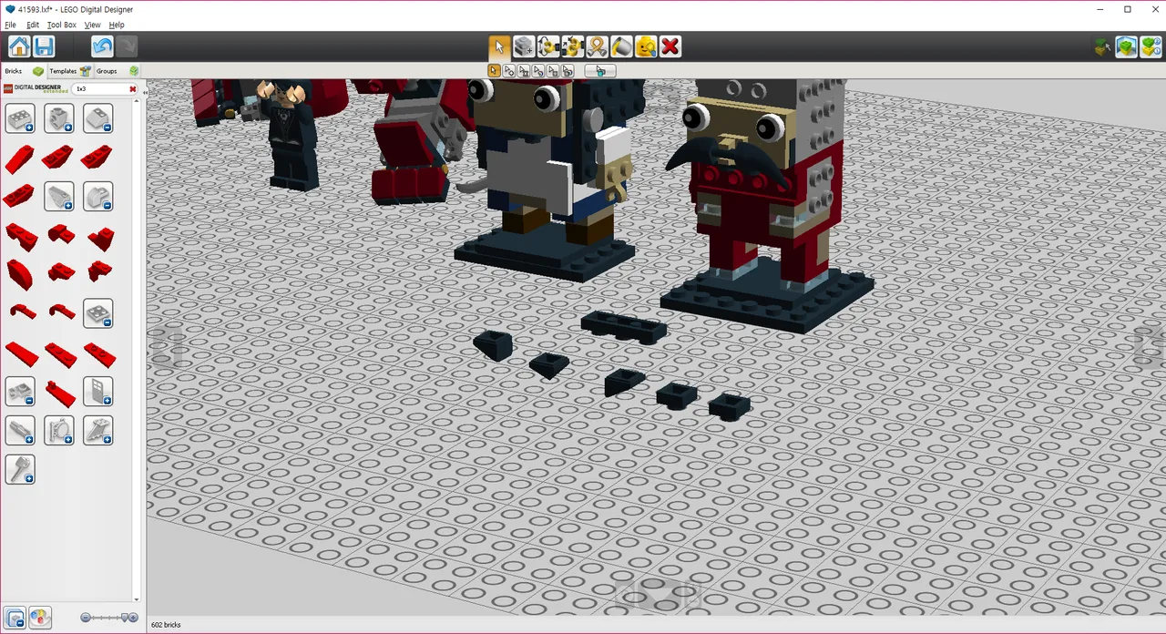 요로케 눈 앞에 이 친구들을 가져다 놓고 LDD 화면에도 과거에 작업해두었던 저장파일을 열어 두 녀석을 불러옵니다. 실물 레고는 만지작 거리며 눈으로 보지만 실질적으로 작업하는 곳은 모니터 안에 있는 LDD 캐드 프로그램입니다.