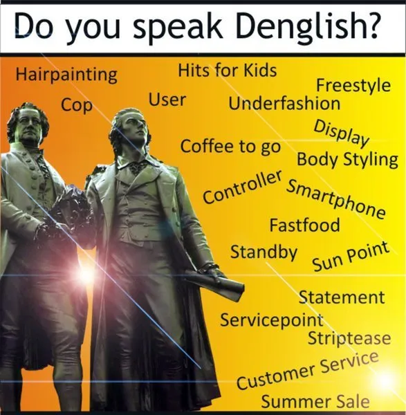 Denglisch (German spelling) or Denglish (English spelling) is a portmanteau of the German words Deutsch and Englisch (English), and can also be used to refer to a portmanteau of English and Dutch. The term is used in all German-speaking countries to refer to the increasingly strong influx of macaronic English or pseudo-English vocabulary (and other features of the language such as grammar and orthography) into German.- Source Wikipedia