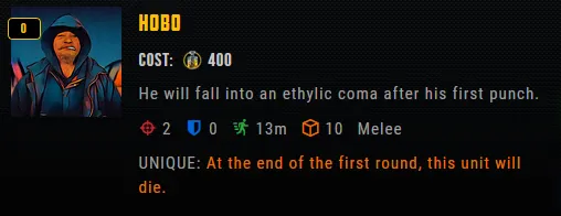 Hobos are now what I call a "discardable" unit, they are gone at first wave of the attack. They cost ALCOHOL, so they might be a good unit to spend balanced resources with another WEAPONS based one.