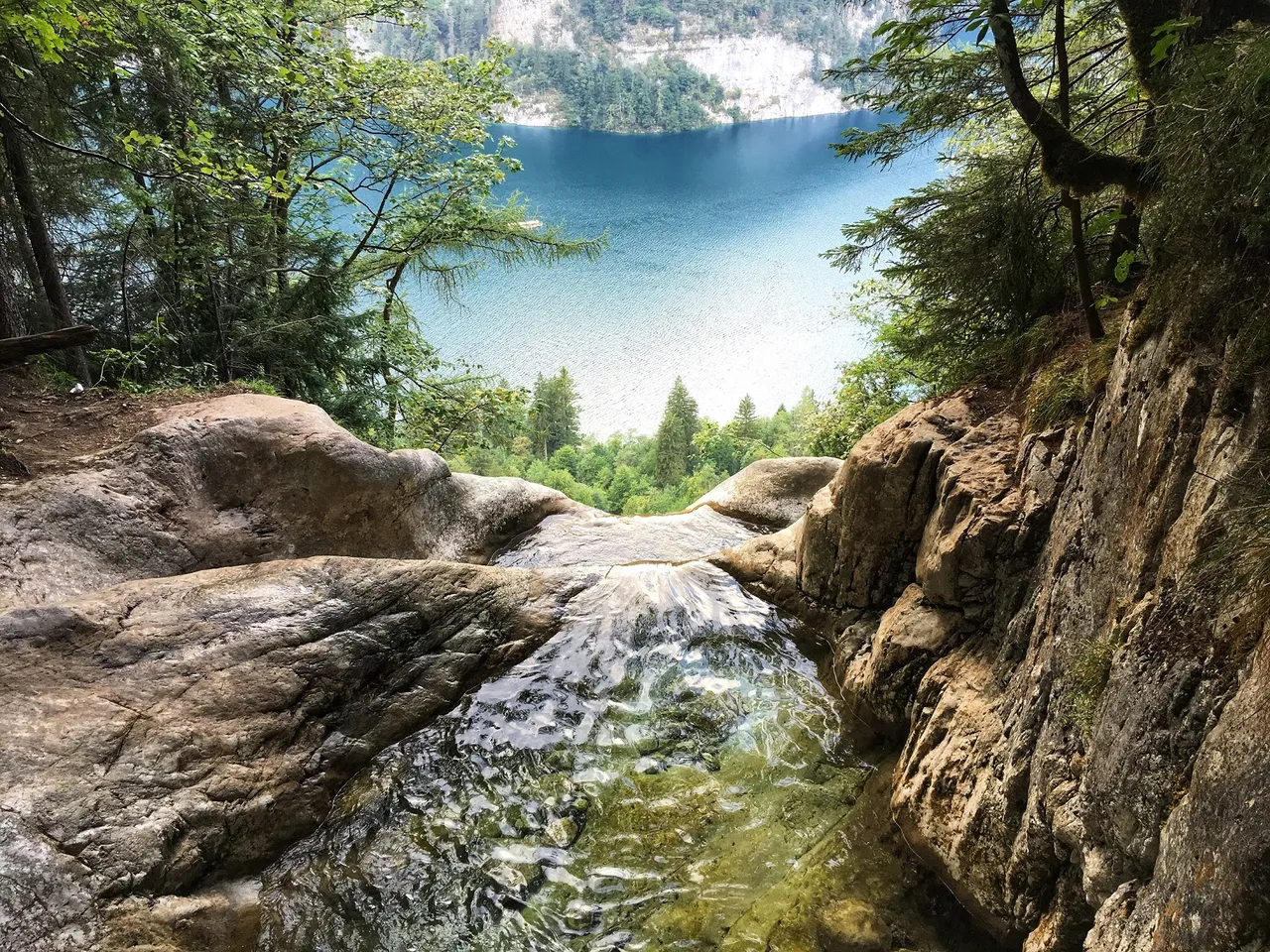 Der wunderschöne Königsbach-Wasserfall ist für mich das Highlight des Königsees. Einmal beim Wasserfall angekommen, kommt man aus dem Staunen nicht mehr heraus. Über die abgerundeten Steine schlängelt sich kristallklares Wasser, welches sich in mehreren kleinen ausgewaschenen Becken sammelt, die über die Jahrtausende hinweg vom Wasser ausgespült wurden. Am Ende der Becken sammelt sich das Wasser zu einem spektakulären Wasserfall zusammen der sich anschließend senkrecht in die Tiefe stürzt. Der malerische Ausblick vom Wasserfall über den See mit den Becken im Vordergrund ist kaum zu überbieten.