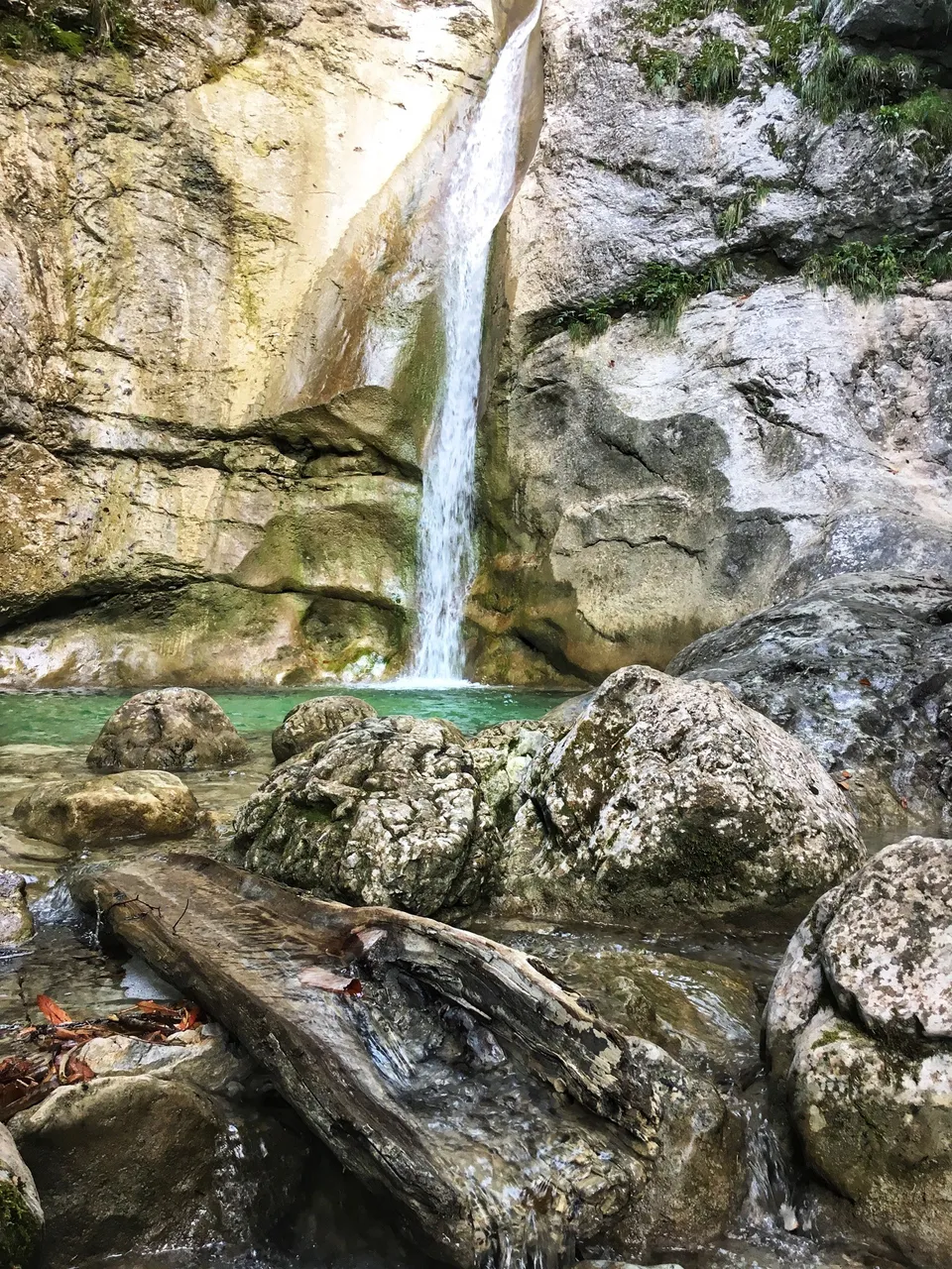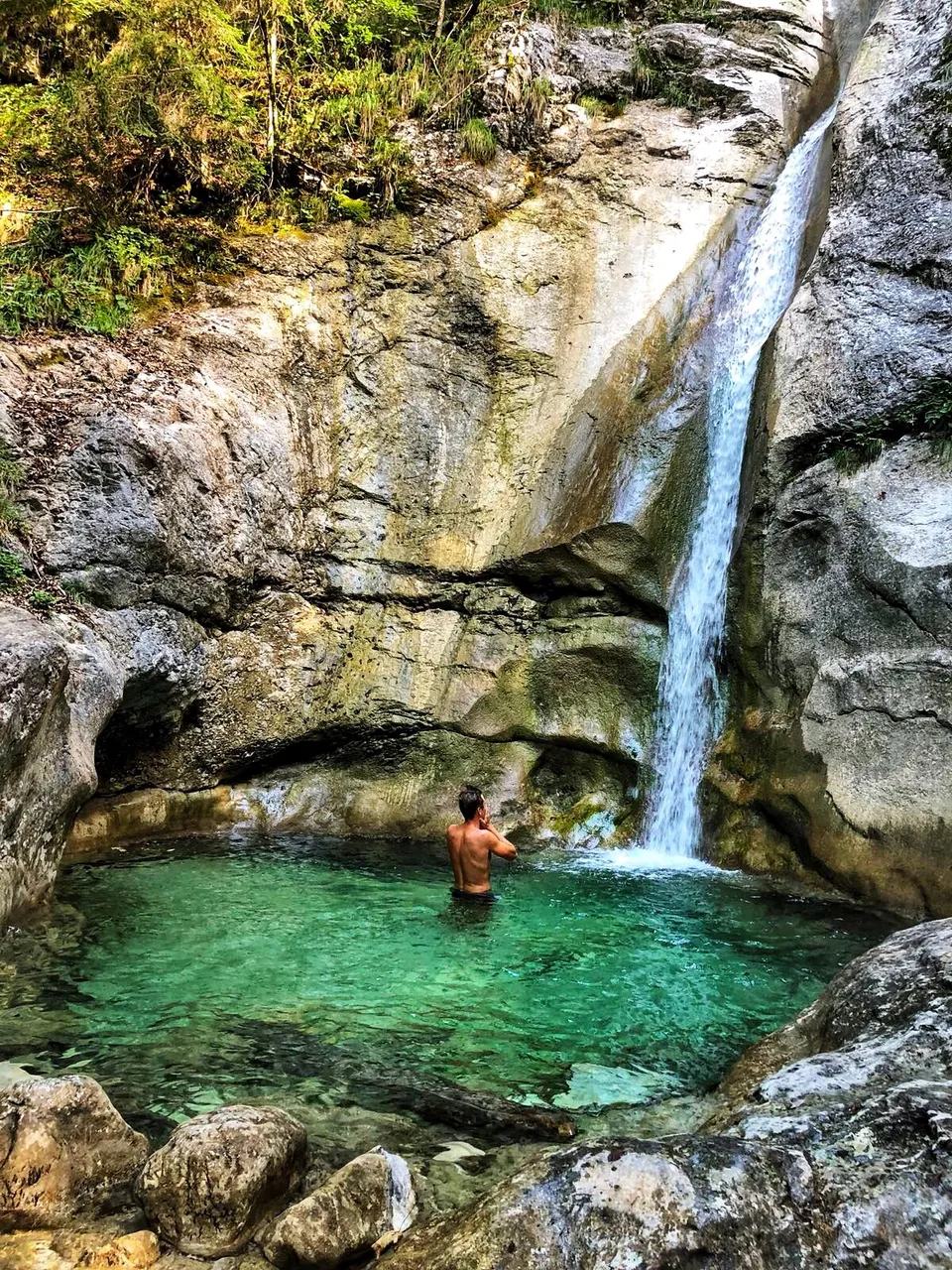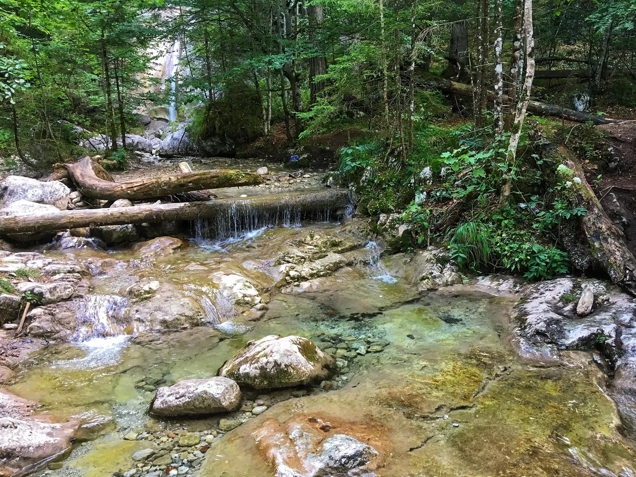 Im hinteren Ende des Baches fällt ein kleinerer Wasserfall in ein glasklares Becken aus Gestein. Auch hier kann man einen Sprung ins kühle Nass wagen. Wer vor den Temperaturen nicht zurückschreckt, kann im Wasserfall sogar eine kleine Dusche nehmen.