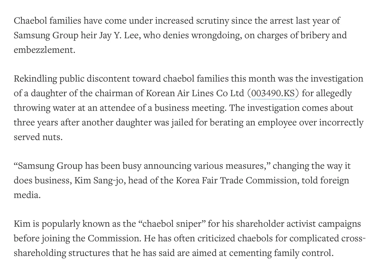 … 재벌 가족들은 삼성그룹 후계자인 Jay Y. Lee가 뇌물죄와 횡령 혐의로 지난 해 구속된 이후 더욱 심한 조사 대상이 되어왔으며, Jay Y. Lee는 불법행위를 한 바 없다고 부인하고 있다. 이번 달 들어 재벌 가족에 대한 대중적 불만에 다시 불을 붙인 것은 회의 참석자에게 물을 뿌렸다는 혐의를 받고 있는 대한항공 회장의 딸에 대한 조사였다. 그 조사는 또 다른 딸이 부적절한 방법으로 견과류를 제공한 승무원에게 난동을 부려 구속된 후 약 3년 만에 벌어진 일이다.김상조 공정거래위원회 위원장은 외국 언론과의 인터뷰에서 삼성이 기업을 운영하는 방식을 바꾸면서 “삼성그룹이 다양한 조치를 발표하느라 여념이 없다”고 전했다. 김 위원장은 공정거래위원회에 들어오기 전 주주 행동주의 활동 켐페인으로 “재벌 사냥꾼”으로 널리 알려져 있었다. 김 위원장은 가족지배를 공고히 하는 것을 목적으로 삼는 복잡한 순환출자 구조를 갖고 있는 점을 두고 종종 재벌을 비난해왔다. ...