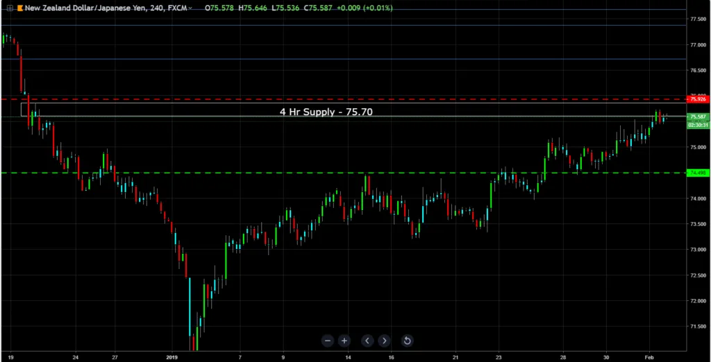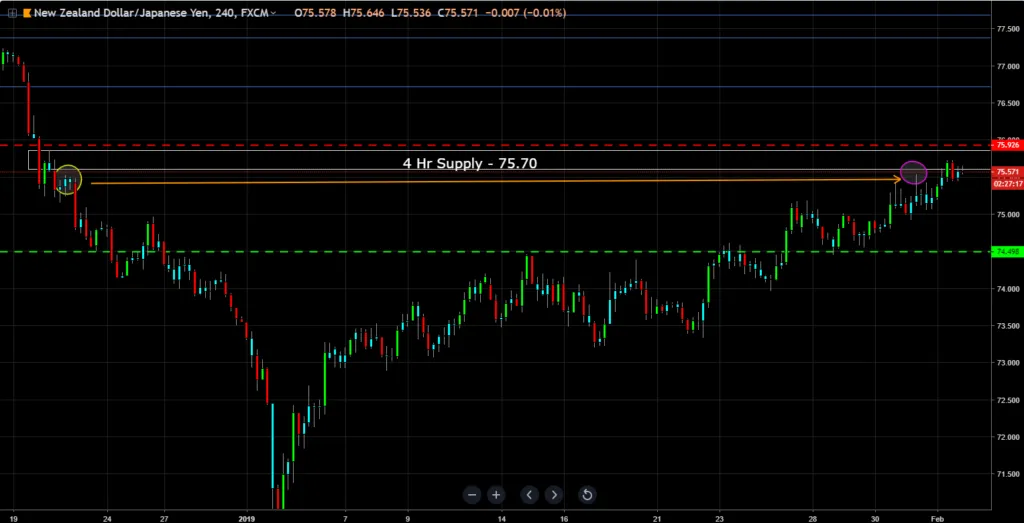 What I like about this zone is its a level on level zone. Meaning as price left the zone it actually formed another zone as indicated by the yellow circle. Price has already reacted to this lower zone as indicated by the wick (pink zone) denoting sellers in the area.
