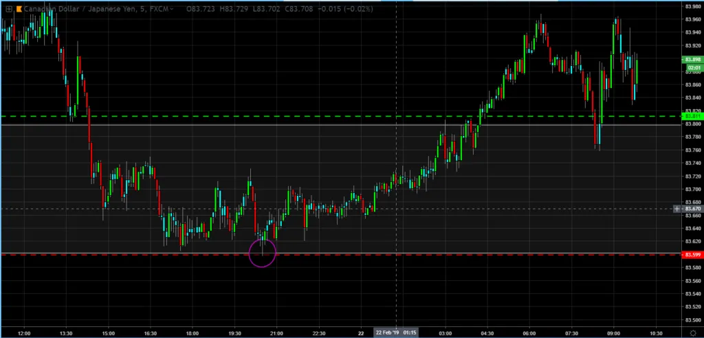 Last night I was stopped out by a tick...probably the spread took me out, before price reversed and eventually moved higher. The below chart shows the price action on the 1 min chart.