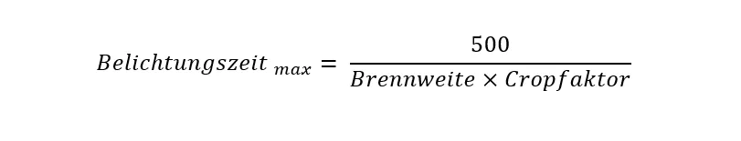 Um konkret bei Astrofotografie zu bleiben: Hier gibt es auch eine einfache Formel die man sich merken kann. Normalerweise will man ja das die Sterne im Foto als scharfe Punkte abgebildet werden, und keine Bewegungsunschärfe bekommen. Wir sind ja im Weltall, unser Planet düst durch diesen mit ~30 000km/h. Dementsprechend entsteht auch hier schnell Bewegungsunschärfe. Die Formel lautet folgendermaßen: