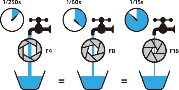 Man will einen Eimer mit einer bestimmten Wassermenge füllen. Um die Wassermenge zu verändern hat man zwei verschiedenen Möglichkeiten. Entweder dreht man nun den Wasserhahn eine gewisse Zeit lang auf (=Belichtungszeit) und verändert immer wie die Dauer bis man den Wasserhahn schließt. Will man einen vollen Kübel lässt man das Wasser länger laufen, braucht man nur wenig Wasser dreht man den Hahn nur ganz kurz auf. Will oder kann man die Zeit aus gewissen Umständen nicht verändern, könnte man auch genauso den Durchmesser des Rohrs justieren. Je größerer der Durchmesser umso mehr Wasser rinnt durch, umso kleiner umso weniger. Dies wäre bei der Fotografie die Blendeneinstellung.