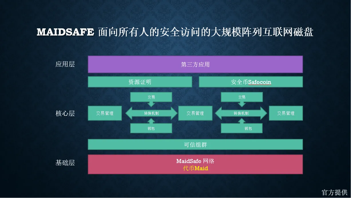 MaidSafe于2006年2月在苏格兰Troon成立,目标是用完全去中心化架构来取代互联网昂贵的数据中心,建立一个全球范围内任何人都可以访问的去中心化储存平台。MaidSafe有一个宏大的目标,就是将所有的互联网服务去中心化。正在进行的工作包括,数字货币钱包,无限文件存储,程序分享,一个去中心化的音乐存储,安全的消息程序,和一个去中心化的数字货币和法币的交易所。当下的互联网,个人数据和隐私泄漏,以及黑客勒索、还有恶意软件和过度监控变得日益严重的今天,MaidSafe必定会引来更多关注的目光。