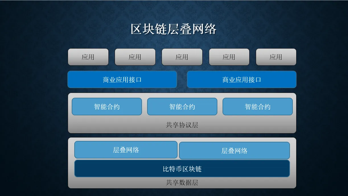 说到区块链,我们不得不说比特币。有人说比特币是虚拟货币,类似某种游戏币,也有人说它是数字黄金,实际上如果光这样认识比特币那就是远远不够的,说到比特币,不得不提比特币存在的这一套系统。这套系统更像是一个帐本,比特币是帐本里面记帐用的数字。为了维持这套系统的正常运行,我们需要程序员为其提供修复漏洞和升级系统的服务,我们也需要矿工通过挖矿也就是记账来保证系统持续的运行,我们更需要用户来使用它建立起信用体系并创造价值,三者谁都不能离不开谁而独立存在。应该说互联网的诞生解决了信息互联的问题,但是没有解决价值互联的问题,或者说在价值互联的问题上解决的不够好,以于于价值不能按照应有的方式来正向传递,生产创造者不能保护自己的应有的权利,剽窃盗用十分严重,因为没有信用记录可查。然而区块链给其上工作的用户打上了时间戳,因为区块链的不可更改性,从而建立了一个不可逆的信用体系。区块链诞生解决了这个让人头疼的问题,它是历史的必然产物,正如前面我们如说,文明发展程度越高,人与人之间的连接越紧密,接触越频繁。比特币作为区块链的第一个应用,就是在这样的时代背景下产生的。比特币的诞生解决了价值交换的功能,但是还没有解决价值绑定后再交换的问题。然而智能合约的出现轻松地解决了这一问题,通过智能合约,社会价值绑定在比特币上再交换,从而实现社会的全面自动化,一个构建在区块链上的层叠结构就这样出现了,如下图所示。