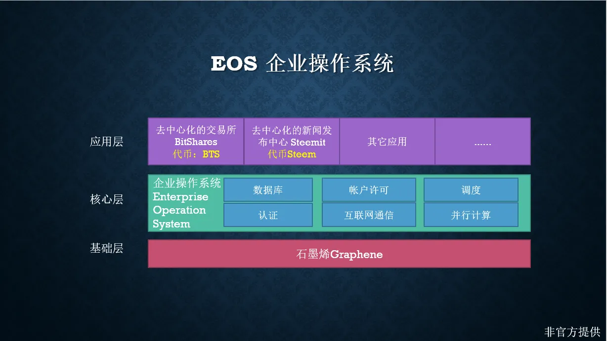 EOS是一个区块链操作系统,它提供了数据库,账号许可,调度,认证和互联网应用通信,这极大地提高了智能商业开发的效率,它使用了并行计算使得把区块链拓展到百万用户和每秒百万次交易成为可能。由于EOS目标是构建一个运行在区块链上的企业操作系统,这将区块链与人类社会拉的更近,拥有多少EOS,就意味着自己拥有多少这个操作系统里的资源。Steemit将作为这个超级企业的新闻发布中心,BitShares将是这个超级企业的交易中心,以后会有更多的应用建立在这个系统里,EOS为亿万用户入驻提供了强有力的根基。