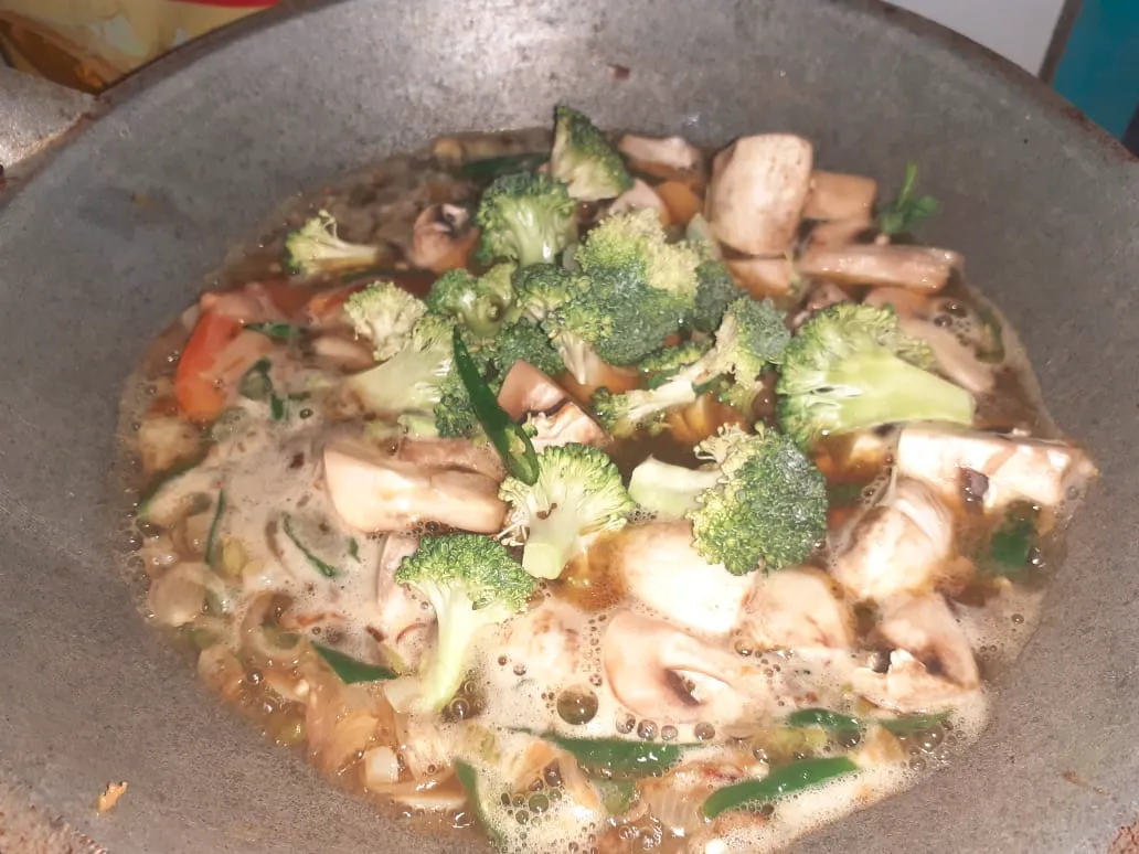 After the water boiled, add broccoli and mushrooms then wait until both withered.