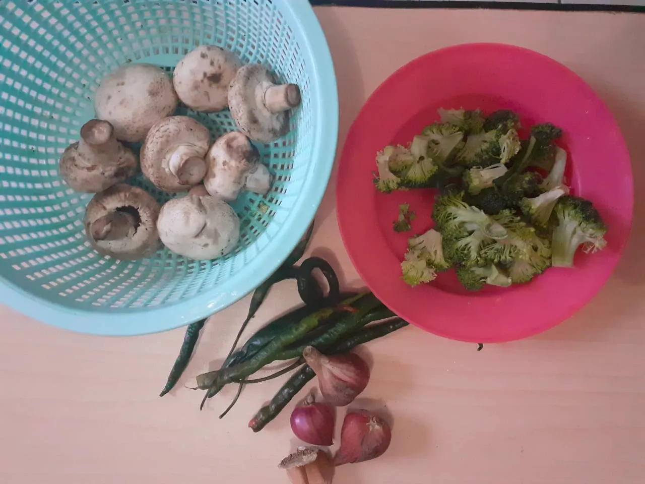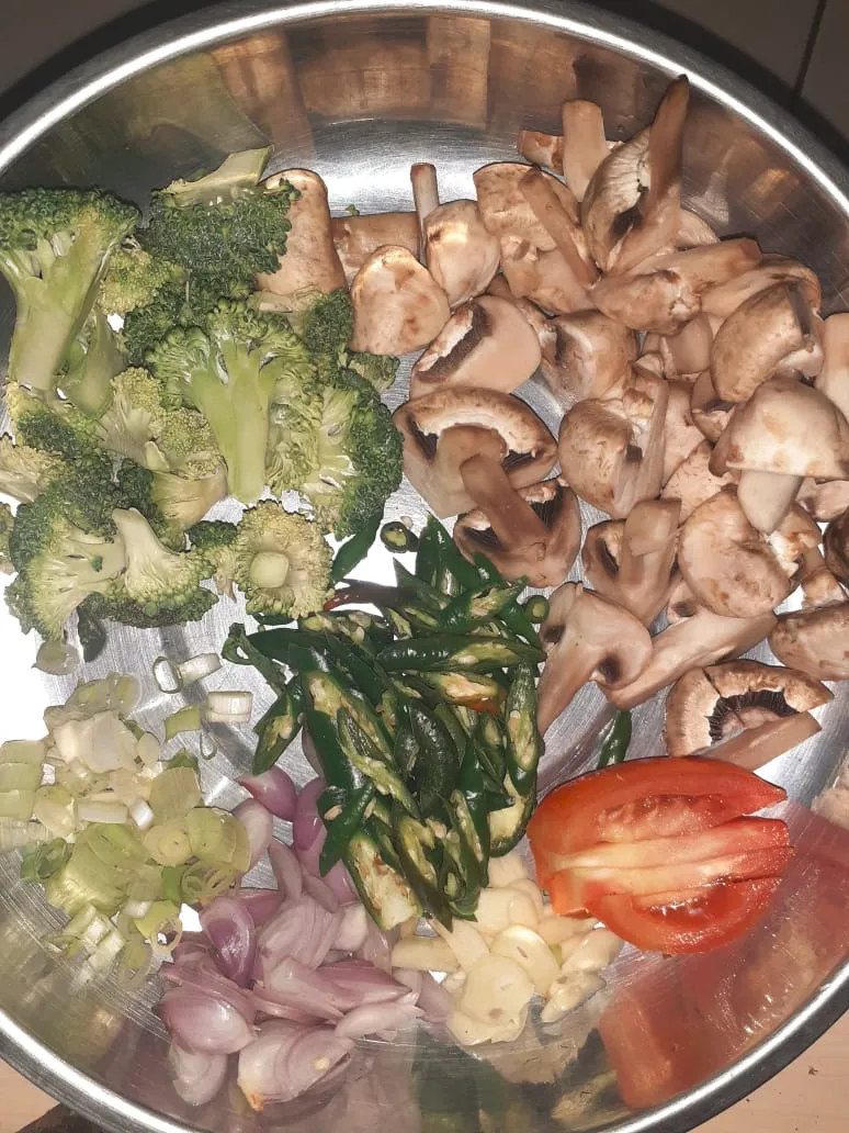 Wash all ingredients till clean. Slice all the ingredients alternately. The things I do first, It's about the main ingredients like mushrooms and broccoli. Then I moving forwards to green chili and union.